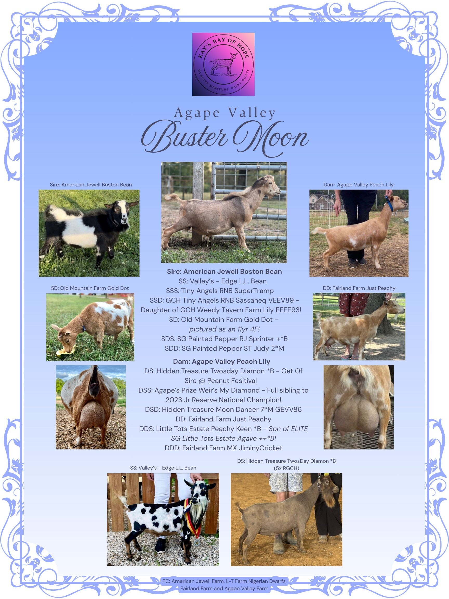Buster Moon is a stunning buck with excellent conformation and a gentle temperament. Moon comes from strong milk lines and pedigrees. The lord blessed us with him and now we want to bless you with his offspring!